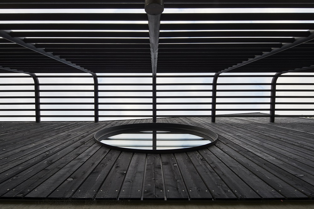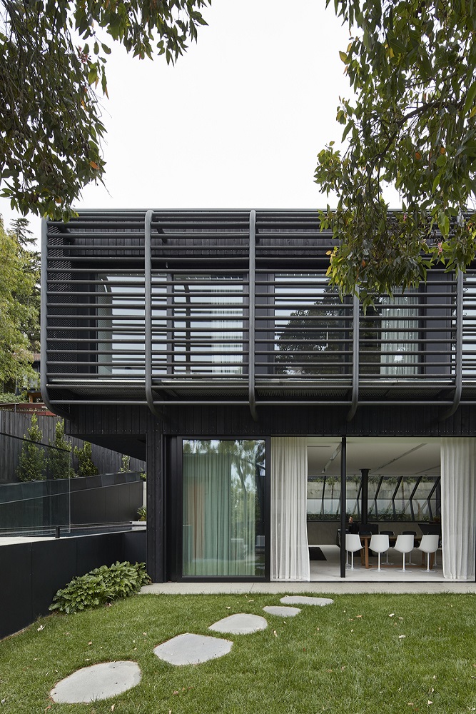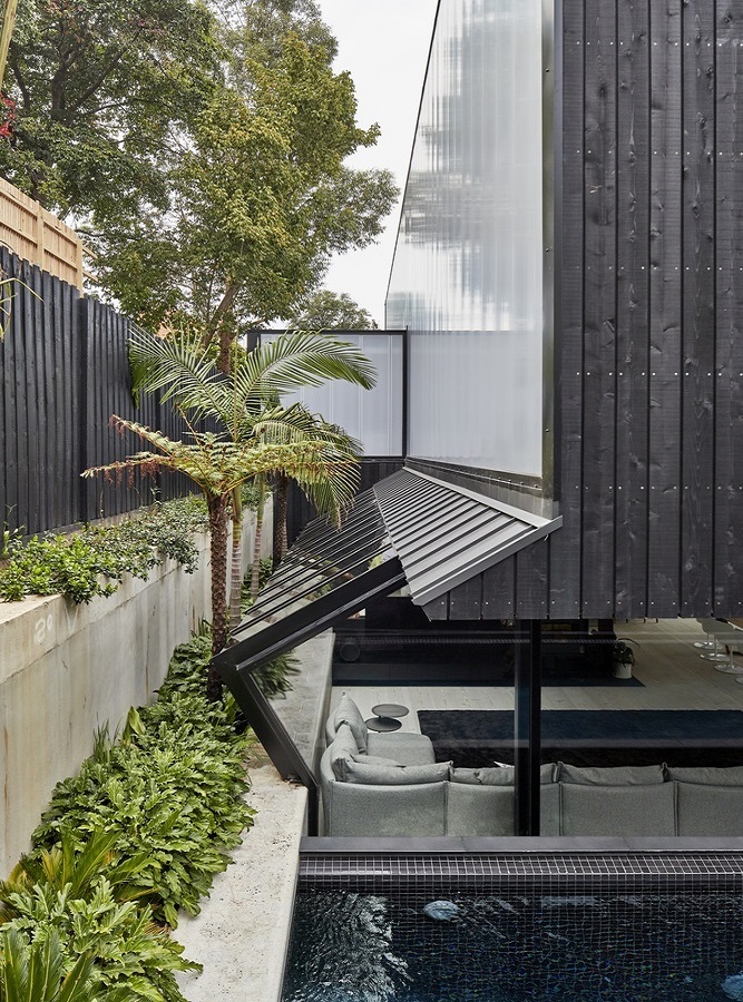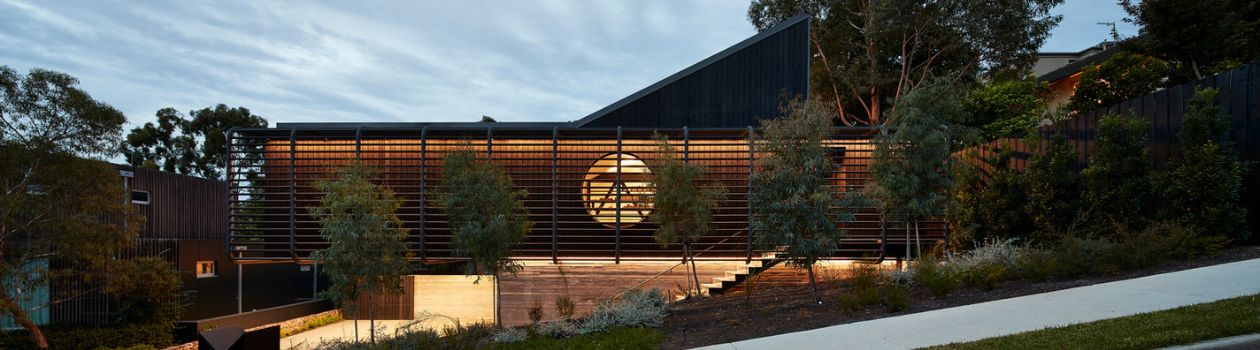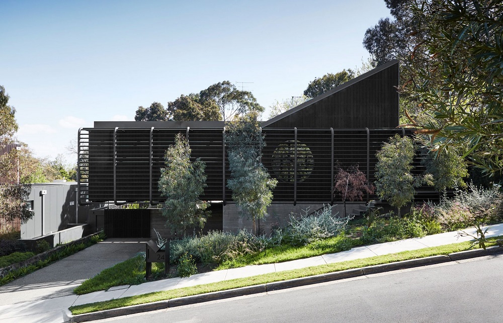 The sloping terrain and unconventional topography of the home creates a perfect balance for indoor and outdoor living. The home perfectly aligns the native tree line scape and references modernist design principles. The home captures an abundance of natural sunlight throughout the blackened timber screens connecting living and built elements.
